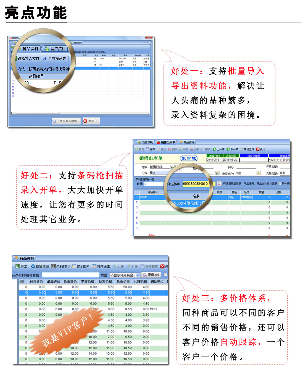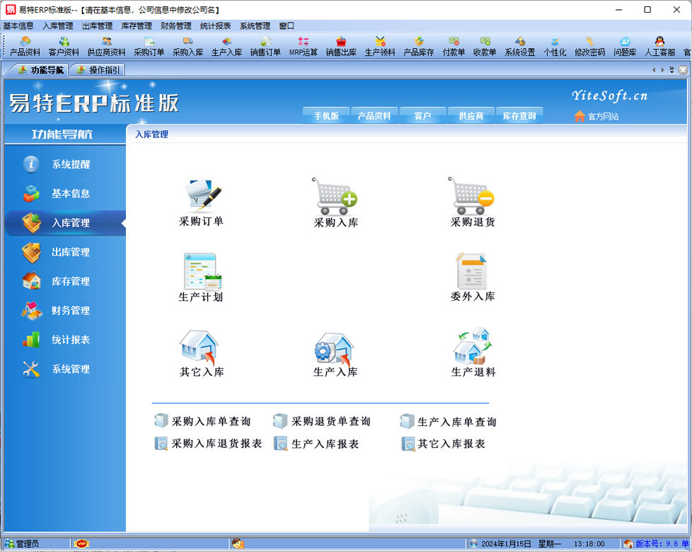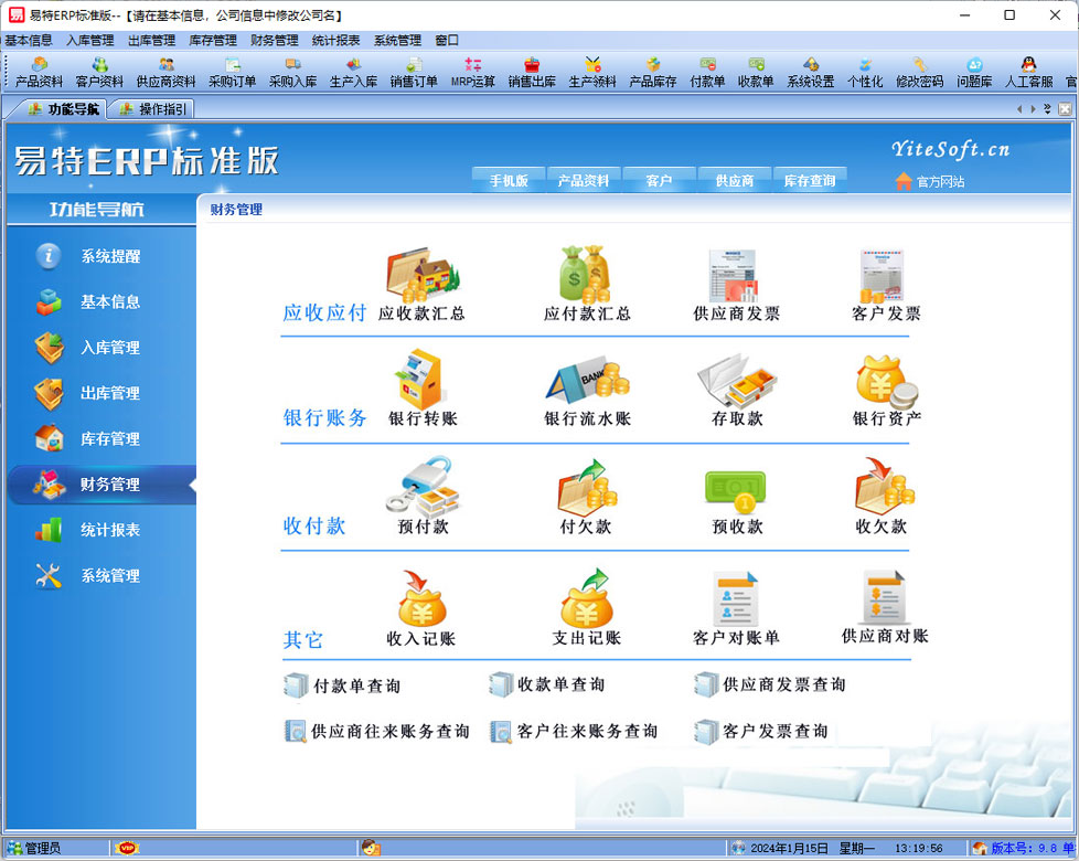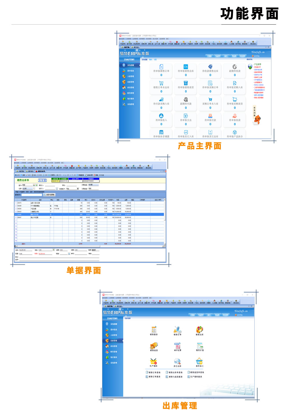 易特ERP標(biāo)準(zhǔn)版是一款專業(yè)的生產(chǎn)制造企業(yè)的ERP管理軟件,可對(duì)成品的BOM設(shè)置,客戶訂單下達(dá)后根據(jù)BOM進(jìn)行MRP物料需求運(yùn)算。其中包含產(chǎn)品銷售管理系統(tǒng) ,庫存管理系統(tǒng)(倉庫管理系統(tǒng)),財(cái)務(wù)和報(bào)表系統(tǒng)等子模塊。軟件界面設(shè)計(jì)簡(jiǎn)潔,美觀,其人性化的軟件流程,使普通用戶不需培訓(xùn)也能很快掌握軟件操作使用方法,上手極易。強(qiáng)大報(bào)表與集成查詢功能是本軟件的最大特色,所有功能在用戶需要的使用地方自然體現(xiàn),不用打開多個(gè)窗口重復(fù)查詢。易特進(jìn)銷存軟件廣泛適用于企業(yè),商貿(mào)公司,個(gè)體門店等用于商業(yè)銷售管理, 庫存管理,財(cái)務(wù)管理等,客戶管理,員工管理等場(chǎng)合,是您企業(yè)進(jìn)行信息化管理的強(qiáng)大工具。 入庫管理:進(jìn)行產(chǎn)品采購入庫,采購?fù)素,采購入庫,委外加工入庫?/p> 出庫管理:銷售訂單,銷售出庫,客戶退貨,生產(chǎn)計(jì)劃,MRP物料需求運(yùn)算,委外加工發(fā)料。 庫存管理:包括庫存之間貨品調(diào)拔,庫存報(bào)損、報(bào)溢,庫存盤點(diǎn)功能。 財(cái)務(wù)管理:預(yù)付款、預(yù)收款,應(yīng)收應(yīng)付款,收入支出,,供應(yīng)商往來帳務(wù),供應(yīng)商付款,客戶往來帳務(wù),客戶付款 。 統(tǒng)計(jì)報(bào)表:完整的統(tǒng)計(jì)查詢功能,每張單據(jù)每次業(yè)務(wù)金額都可以清楚的反映。 權(quán)限管理:可添加刪除系統(tǒng)操作員帳號(hào),強(qiáng)大的權(quán)限控制,可以設(shè)置某用戶對(duì)某窗口某個(gè)按鈕的權(quán)限。 打印設(shè)計(jì):可對(duì)系統(tǒng)內(nèi)每個(gè)單據(jù)進(jìn)行打印的格式設(shè)計(jì),可以導(dǎo)出,導(dǎo)入,每個(gè)操作員可設(shè)計(jì)自己的打印格式。 界面設(shè)計(jì):系統(tǒng)窗口界面名稱可以自定義設(shè)計(jì),表格的顯示順序,寬度,是否顯示等,每個(gè)操作員可以設(shè)計(jì)自己的界面。 系統(tǒng)設(shè)置:可以靈活設(shè)置系統(tǒng)小數(shù)位數(shù),可選0-6位,讓帳務(wù)更精確,可對(duì)以往數(shù)據(jù)進(jìn)行選擇性的清除,以便系統(tǒng)初始化。 數(shù)據(jù)備份:可隨時(shí)對(duì)系統(tǒng)數(shù)據(jù)庫進(jìn)行安全備份,以防數(shù)據(jù)丟失。 |