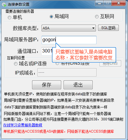 2、客戶端設(shè)置連接參數(shù),在局域網(wǎng)服務(wù)器IP里輸入服務(wù)器電腦的名稱即可,IP和電腦名稱是同等的也用服務(wù)器電腦的IP。建議用電腦名稱,這樣當(dāng)IP變了不會(huì)影響。