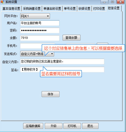 1.【系統(tǒng)管理】-----【系統(tǒng)設(shè)置】------【短信設(shè)置】,如圖所示,發(fā)送格式根據(jù)需要選,主要是針對銷售出庫單窗口,發(fā)送通知功能,可以調(diào)用銷售單號(hào),銷售單備注,快遞單號(hào)等。