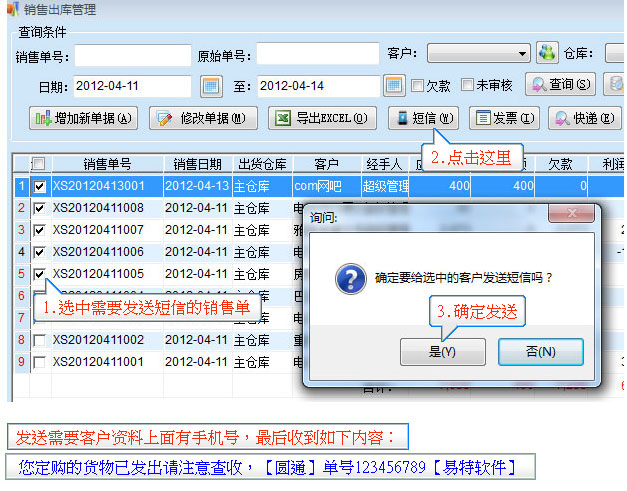 2、打開銷售出庫管理窗口,選中需要知的銷售單號(hào),并點(diǎn)擊短信按鈕即可發(fā)送。
