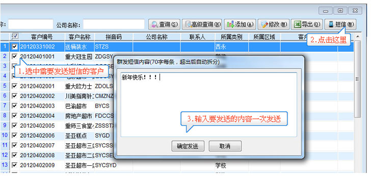 3.群發(fā)短信,打開客戶資料管理窗口,選中需要發(fā)送的客戶,點(diǎn)擊短信按鈕,輸入需要群發(fā)的內(nèi)容即可。
