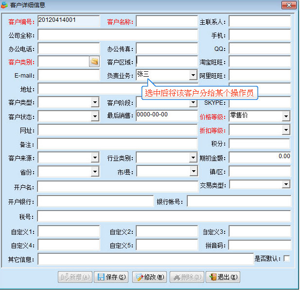 2、打開(kāi)客戶資料,上面負(fù)責(zé)業(yè)務(wù),選中分配給哪個(gè)操作員,如果非管理員建立的客戶,默認(rèn)則是自己。
