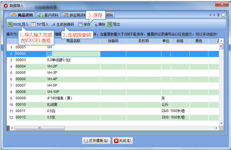 導(dǎo)入作用:代替前面手工單個貨品的建立,和庫存的開帳,可以一次導(dǎo)入所有的貨品資料,庫存等信息