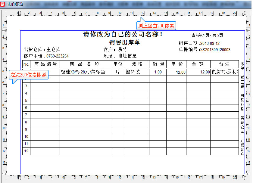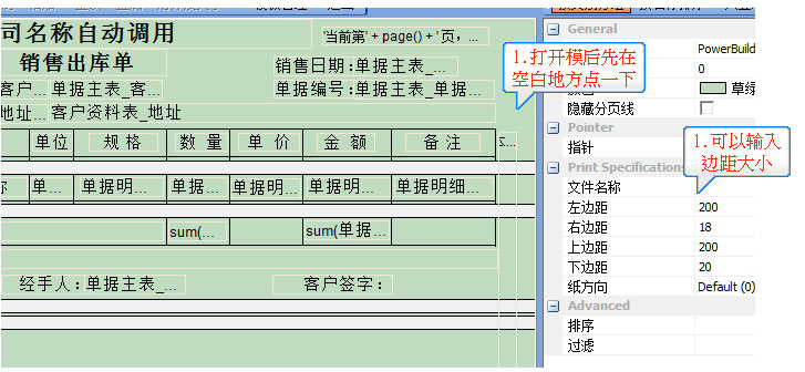 默認模板左右邊距都很小,如果打印時太靠邊了,可以在模板上設置邊距,該數(shù)值為像值,100=1CM左右,如圖調(diào)整了200的左和上邊距,但是要注意,不能太寬超出了紙的大小,這樣左邊太寬,則右邊會無法打印出來