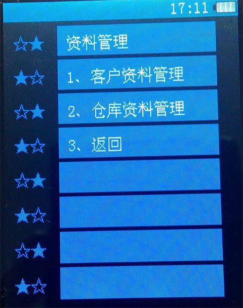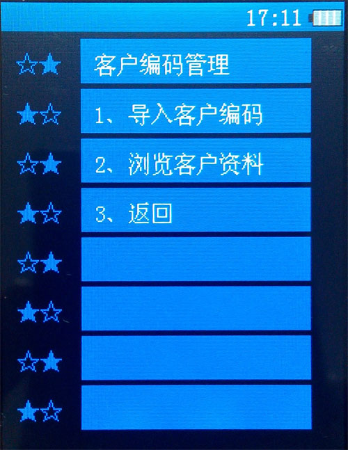 打開(kāi)盤點(diǎn)機(jī),在主機(jī)界面上點(diǎn)擊【資料管理】打開(kāi)如下圖,點(diǎn)擊【客戶資料管理】,按1【導(dǎo)入客戶編碼】則會(huì)將U盤上的KH.TXT中的數(shù)據(jù)導(dǎo)入盤點(diǎn)機(jī)中,如果不導(dǎo)入會(huì)無(wú)法調(diào)用,而商品資料則不需要導(dǎo)入