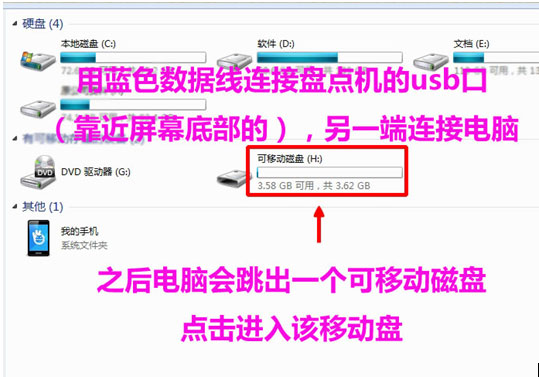 先將盤點(diǎn)機(jī)的USB數(shù)據(jù)線連接盤點(diǎn)機(jī)(下面的USB口,上面僅充電用),打開(kāi)盤點(diǎn)機(jī),按下【USB連接】功能,打開(kāi)【我的電腦】找到U盤盤符打開(kāi)如下圖