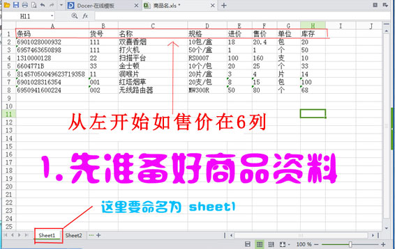 從軟件中導(dǎo)出商品資料表格,并在左下腳的名稱【工作表1】修改為【sheet1】最后保存
