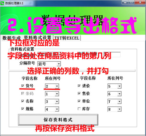 打開(kāi)工具后設(shè)置后選【資料格式設(shè)置】選項(xiàng)卡,錄下圖所示,設(shè)置好字段所在表格中的列數(shù)并保存