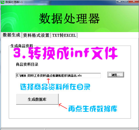 回到【數(shù)據(jù)生成】選項(xiàng)卡如下圖,點(diǎn)擊【瀏覽】找到從軟件中導(dǎo)出的EXCEL表格文件后點(diǎn)擊【生成數(shù)據(jù)庫(kù)】則生成INF.TXT文件