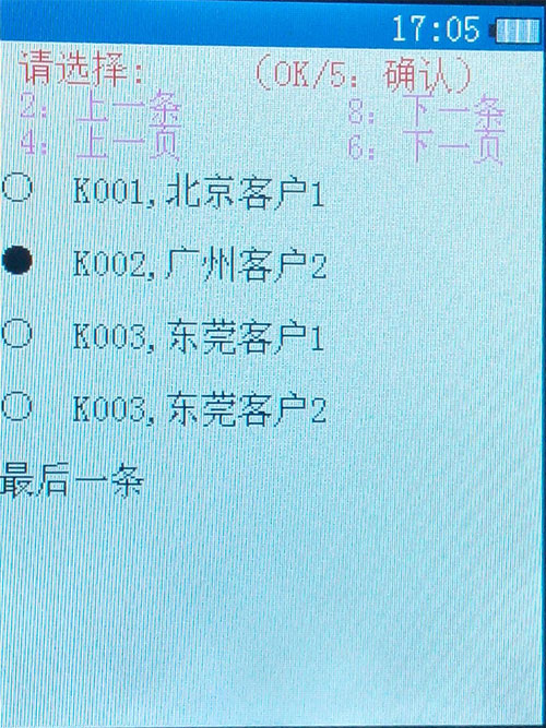 按數(shù)字鍵進(jìn)入相應(yīng)的功能,如按1【出庫(kù)掃描】后提示選擇客戶,按下OK鍵后打開(kāi)如下界面選擇