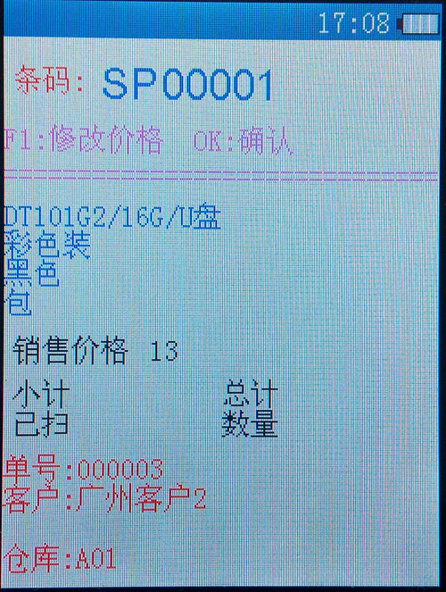 掃描條碼自動(dòng)調(diào)用盤點(diǎn)機(jī)之前導(dǎo)入的商品中資料及價(jià)格,如需要修改價(jià)格可按下F1