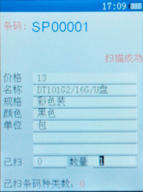 打開(kāi)掃描界面,此時(shí)按下OK鍵后,盤點(diǎn)機(jī)前端會(huì)出線紅色激光線條,對(duì)準(zhǔn)條碼掃描后如下圖