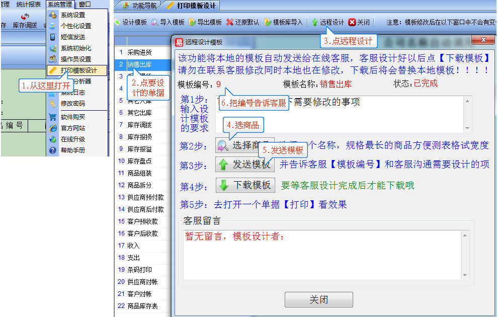 打開【系統(tǒng)管理】----【打印模板設(shè)計(jì)】如下圖,左邊點(diǎn)擊要設(shè)計(jì)的模板,點(diǎn)【遠(yuǎn)程設(shè)計(jì)】,選擇一個(gè)商品信息,點(diǎn)【發(fā)送模板】將本地原有模板發(fā)送給客服,并告訴客服模板的編號,客服設(shè)計(jì)好以后點(diǎn)【下載模板】成功后在軟件中打印看效果