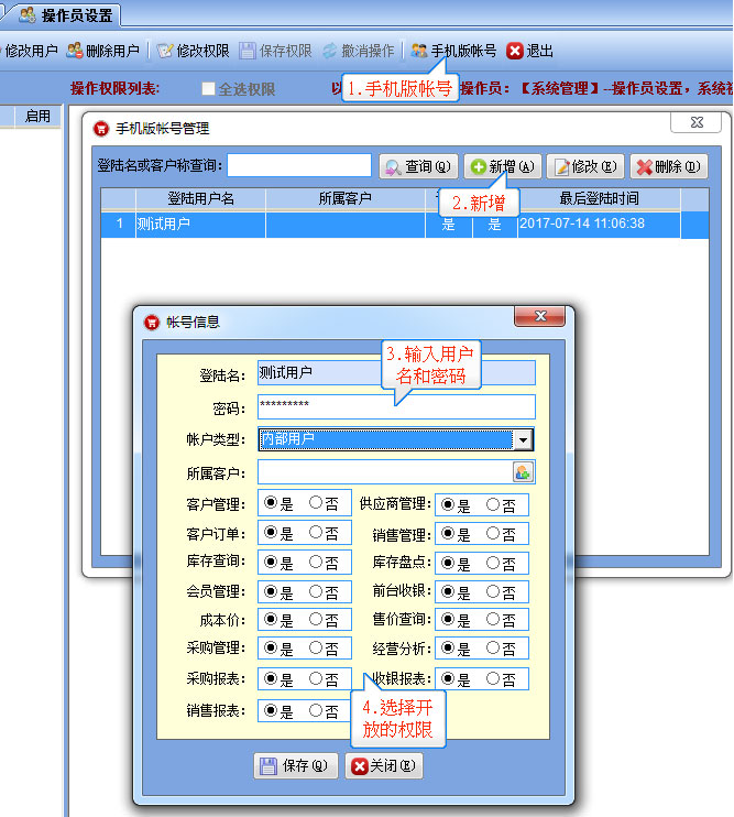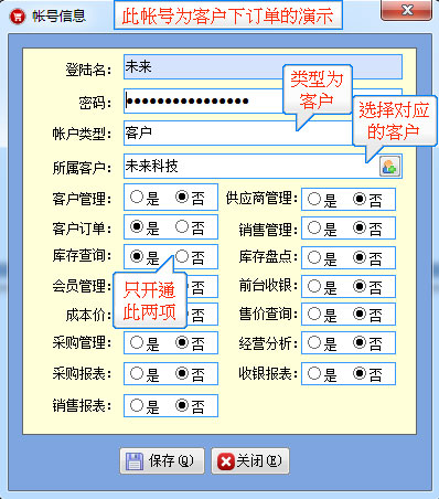 帳號類型:如果為【內(nèi)部用戶】在開客戶訂單時可以選擇客戶及輸入價格,為【客戶】時不能選客戶和修改價格。