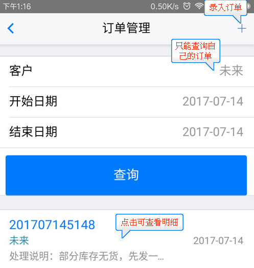 在軟件中接收客戶的訂單,轉(zhuǎn)單生成為正式的客戶訂單后再銷售出庫即可,在APP中能查詢到發(fā)貨的情況。