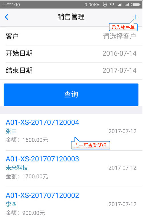 單據(jù)查詢界面,可選擇條件進行查詢,點擊條目打開對應(yīng)的單