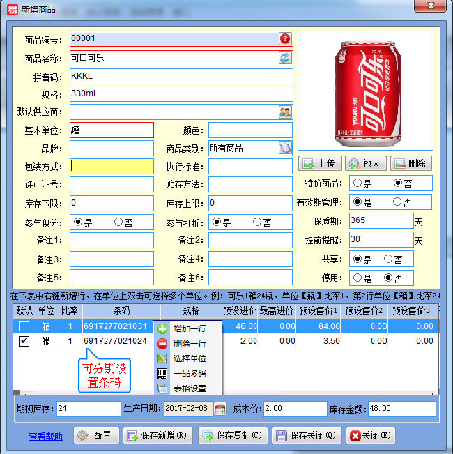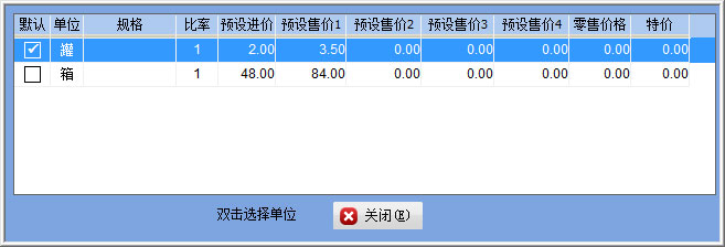 選擇好基本單位【罐】下圖表格是自動(dòng)增加一行單位為【罐】的默認(rèn)單位,可設(shè)置罐裝的條碼及售價(jià)信息,然后在表格上右鍵【增加一行】然后在單位上雙