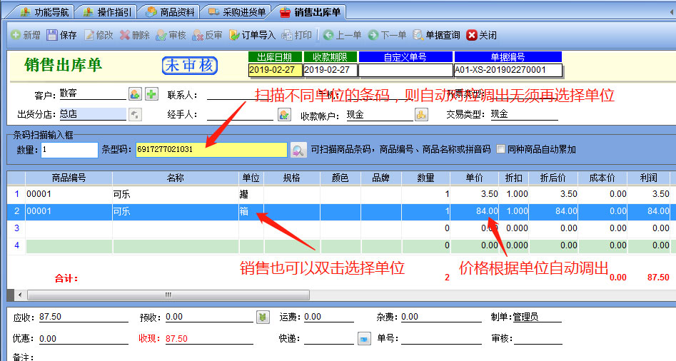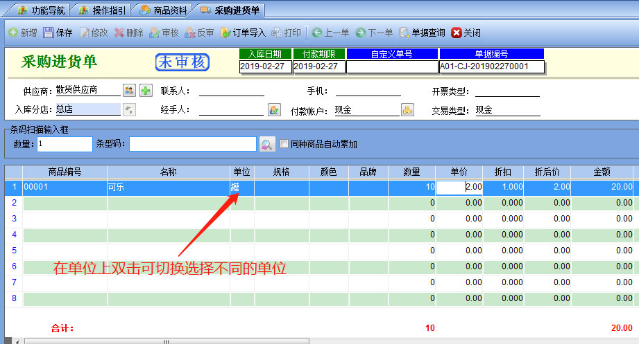 采購(gòu)進(jìn)貨開單時(shí)調(diào)出商品后,也可以在單位上雙擊進(jìn)行不同的單位選擇,也可以直接掃描對(duì)應(yīng)的條碼自動(dòng)調(diào)出不同的單位。