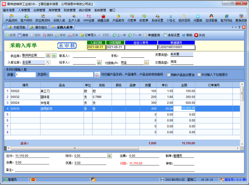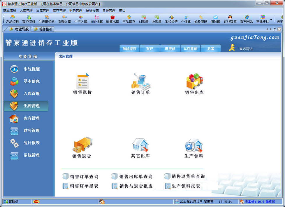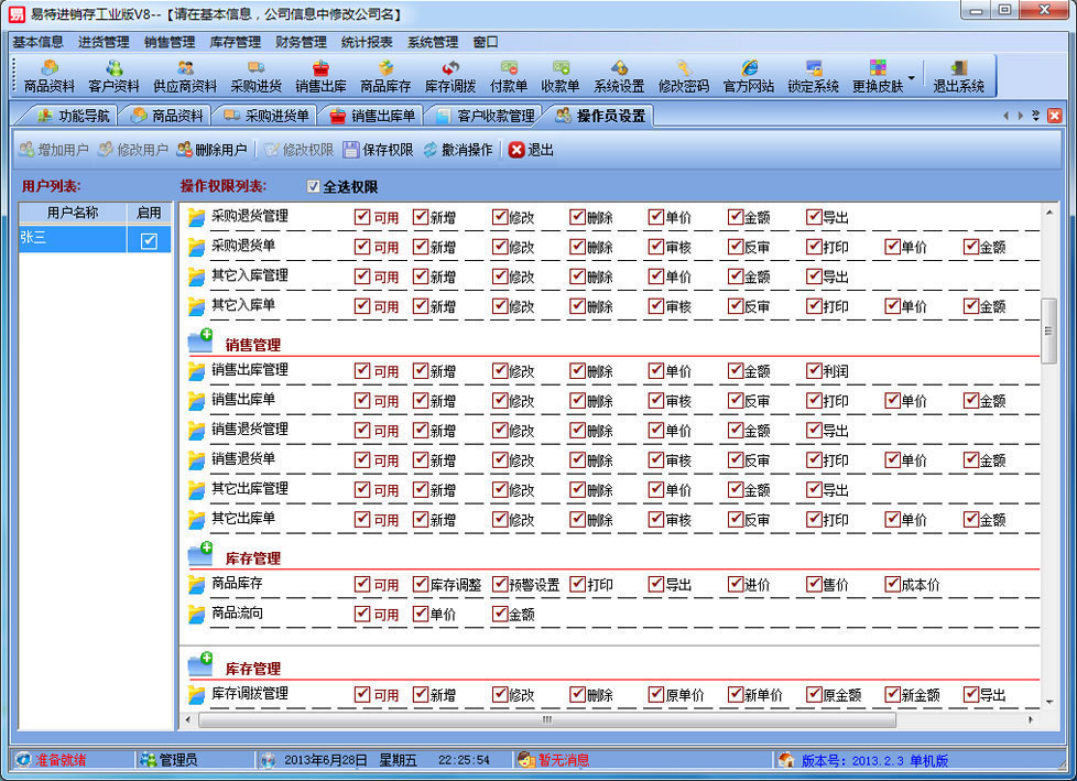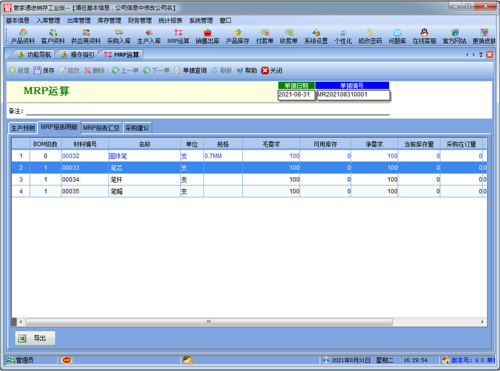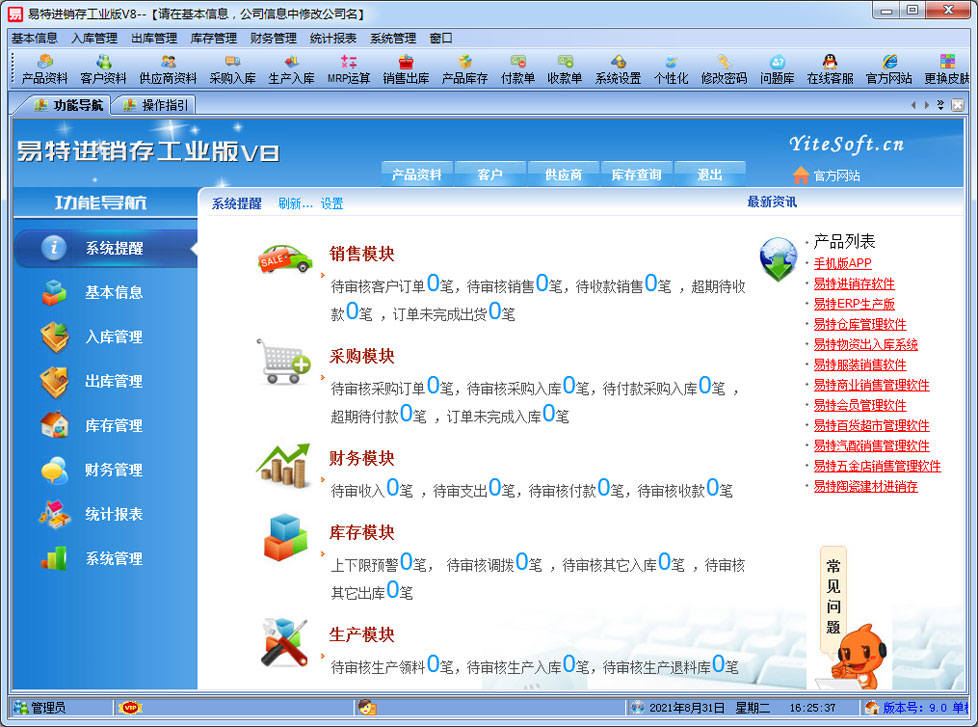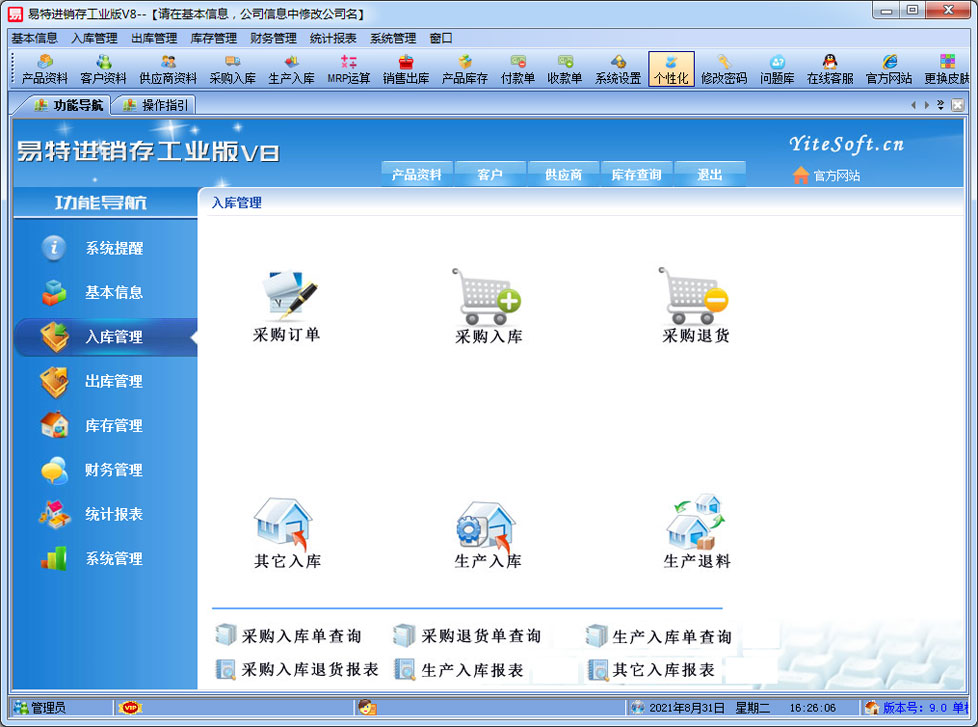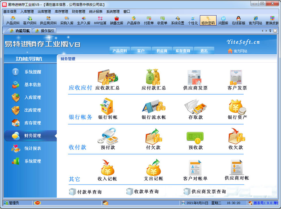 易特進銷存工業(yè)版是一款專業(yè)的生產(chǎn)制造企業(yè)的進銷存管理軟件,可對成品的BOM設(shè)置,客戶訂單下達(dá)后根據(jù)BOM進行MRP物料需求運算。其中包含產(chǎn)品銷售管理系統(tǒng) ,庫存管理系統(tǒng)(倉庫管理系統(tǒng)),財務(wù)和報表系統(tǒng)等子模塊。軟件界面設(shè)計簡潔,美觀,其人性化的軟件流程,使普通用戶不需培訓(xùn)也能很快掌握軟件操作使用方法,上手極易。強大報表與集成查詢功能是本軟件的最大特色,所有功能在用戶需要的使用地方自然體現(xiàn),不用打開多個窗口重復(fù)查詢。易特進銷存軟件廣泛適用于企業(yè),商貿(mào)公司,個體門店等用于商業(yè)銷售管理, 庫存管理,財務(wù)管理等,客戶管理,員工管理等場合,是您企業(yè)進行信息化管理的強大工具。 入庫管理:進行產(chǎn)品采購入庫,采購?fù)素,采購入庫,委外加工入庫?/p> 出庫管理:銷售訂單,銷售出庫,客戶退貨,MRP物料需求運算,委外加工發(fā)料。 庫存管理:包括庫存之間貨品調(diào)拔,庫存報損、報溢,庫存盤點功能。 財務(wù)管理:預(yù)付款、預(yù)收款,應(yīng)收應(yīng)付款,收入支出,,供應(yīng)商往來帳務(wù),供應(yīng)商付款,客戶往來帳務(wù),客戶付款 。 統(tǒng)計報表:完整的統(tǒng)計查詢功能,每張單據(jù)每次業(yè)務(wù)金額都可以清楚的反映。 權(quán)限管理:可添加刪除系統(tǒng)操作員帳號,強大的權(quán)限控制,可以設(shè)置某用戶對某窗口某個按鈕的權(quán)限。 打印設(shè)計:可對系統(tǒng)內(nèi)每個單據(jù)進行打印的格式設(shè)計,可以導(dǎo)出,導(dǎo)入,每個操作員可設(shè)計自己的打印格式。 界面設(shè)計:系統(tǒng)窗口界面名稱可以自定義設(shè)計,表格的顯示順序,寬度,是否顯示等,每個操作員可以設(shè)計自己的界面。 系統(tǒng)設(shè)置:可以靈活設(shè)置系統(tǒng)小數(shù)位數(shù),可選0-6位,讓帳務(wù)更精確,可對以往數(shù)據(jù)進行選擇性的清除,以便系統(tǒng)初始化。 數(shù)據(jù)備份:可隨時對系統(tǒng)數(shù)據(jù)庫進行安全備份,以防數(shù)據(jù)丟失。 |