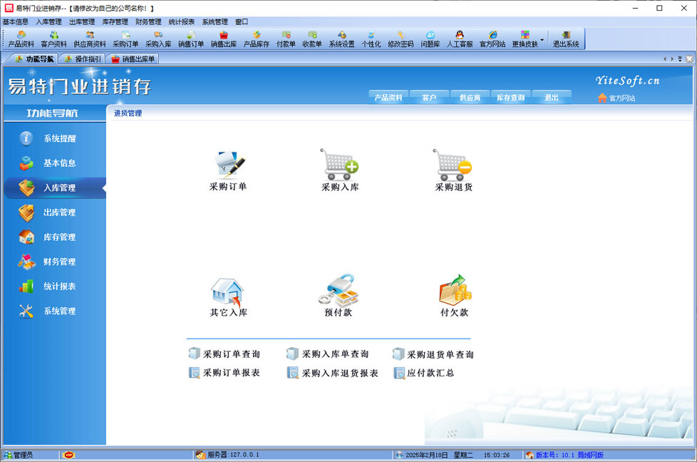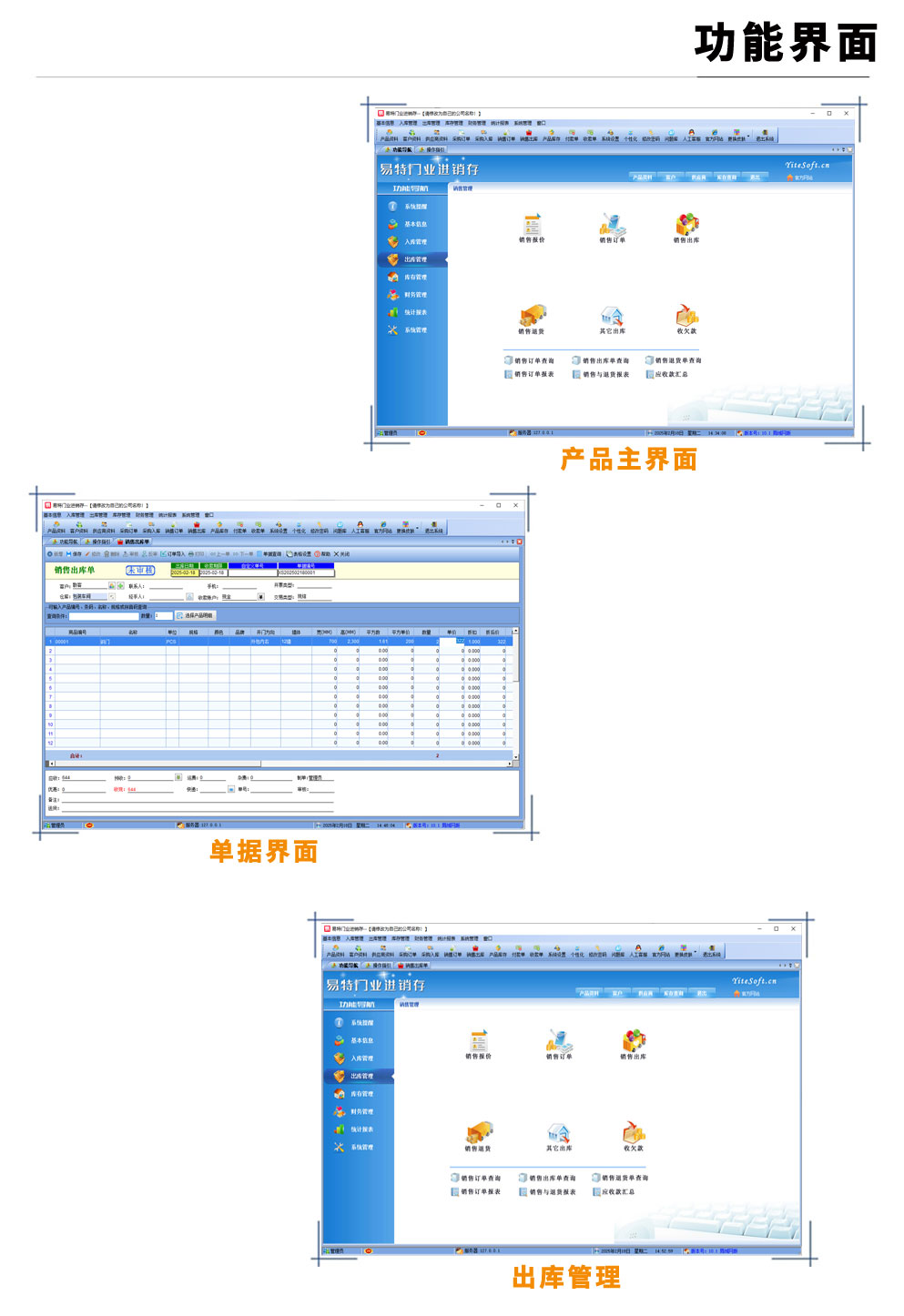 易特門(mén)業(yè)進(jìn)銷存是一款專業(yè)的針對(duì)門(mén)窗行業(yè)而設(shè)計(jì)的進(jìn)銷存軟件,開(kāi)單可以輸入寬高計(jì)算平方數(shù),輸入平方單價(jià)*數(shù)量計(jì)算金額,產(chǎn)品屬屬上可以設(shè)置計(jì)價(jià)方式,即可以按平方計(jì)價(jià),也可以按單位數(shù)量計(jì)價(jià),其中包含商品銷售管理系統(tǒng) ,庫(kù)存管理系統(tǒng)(倉(cāng)庫(kù)管理系統(tǒng)),財(cái)務(wù)和報(bào)表系統(tǒng)等子模塊。軟件界面設(shè)計(jì)簡(jiǎn)潔,美觀,其人性化的軟件流程,使普通用戶不需培訓(xùn)也能很快掌握軟件操作使用方法,上手極易。強(qiáng)大報(bào)表與集成查詢功能是本軟件的最大特色,所有功能在用戶需要的使用地方自然體現(xiàn),不用打開(kāi)多個(gè)窗口重復(fù)查詢。易特進(jìn)銷存軟件廣泛適用于企業(yè),商貿(mào)公司,個(gè)體門(mén)店等用于商業(yè)銷售管理, 庫(kù)存管理,財(cái)務(wù)管理等,客戶管理,員工管理等場(chǎng)合,是您企業(yè)進(jìn)行信息化管理的強(qiáng)大工具。 基礎(chǔ)數(shù)據(jù):產(chǎn)品信息,供應(yīng)商,客戶,商品分類,倉(cāng)庫(kù),銀行,計(jì)量單位等基本信息的設(shè)置。 入庫(kù)管理:采購(gòu)訂單,進(jìn)行產(chǎn)品采購(gòu)入庫(kù),采購(gòu)?fù)素洠M(jìn)貨單據(jù)和退貨單據(jù)查詢,供應(yīng)商往來(lái)帳務(wù),供應(yīng)商付款。 出庫(kù)管理:銷售訂單,銷售出貨,客戶退貨,銷售單據(jù)和客戶退貨查詢,客戶往來(lái)帳務(wù),客戶付款。 庫(kù)存管理:包括庫(kù)存之間貨品調(diào)拔,庫(kù)存報(bào)損、報(bào)溢,庫(kù)存盤(pán)點(diǎn)功能。 統(tǒng)計(jì)報(bào)表:完整的統(tǒng)計(jì)查詢功能,每張單據(jù)每次業(yè)務(wù)金額都可以清楚的反映。 權(quán)限管理:可添加刪除系統(tǒng)操作員帳號(hào),強(qiáng)大的權(quán)限控制,可以設(shè)置某用戶對(duì)某窗口某個(gè)按鈕的權(quán)限。 打印設(shè)計(jì):可對(duì)系統(tǒng)內(nèi)每個(gè)單據(jù)進(jìn)行打印的格式設(shè)計(jì),可以導(dǎo)出,導(dǎo)入,每個(gè)操作員可設(shè)計(jì)自己的打印格式。 界面設(shè)計(jì):系統(tǒng)窗口界面名稱可以自定義設(shè)計(jì),表格的顯示順序,寬度,是否顯示等,每個(gè)操作員可以設(shè)計(jì)自己的界面。 系統(tǒng)設(shè)置:可以靈活設(shè)置系統(tǒng)小數(shù)位數(shù),可選0-6位,讓帳務(wù)更精確,可對(duì)以往數(shù)據(jù)進(jìn)行選擇性的清除,以便系統(tǒng)初始化。 數(shù)據(jù)備份:可隨時(shí)對(duì)系統(tǒng)數(shù)據(jù)庫(kù)進(jìn)行安全備份,以防數(shù)據(jù)丟失。 |