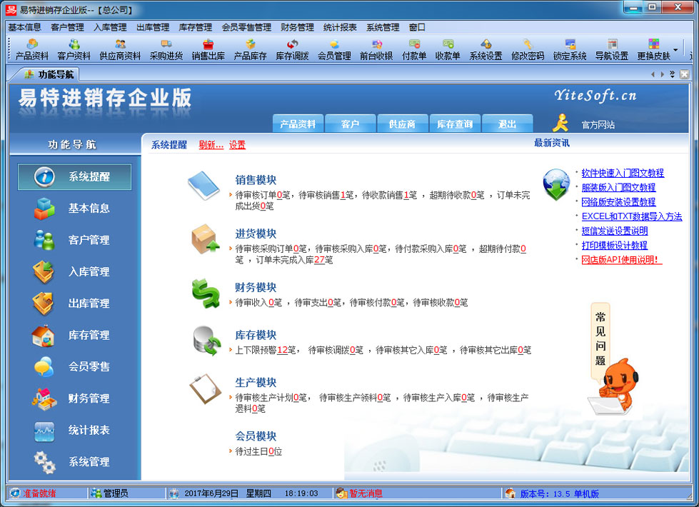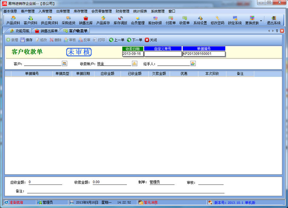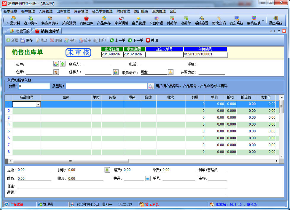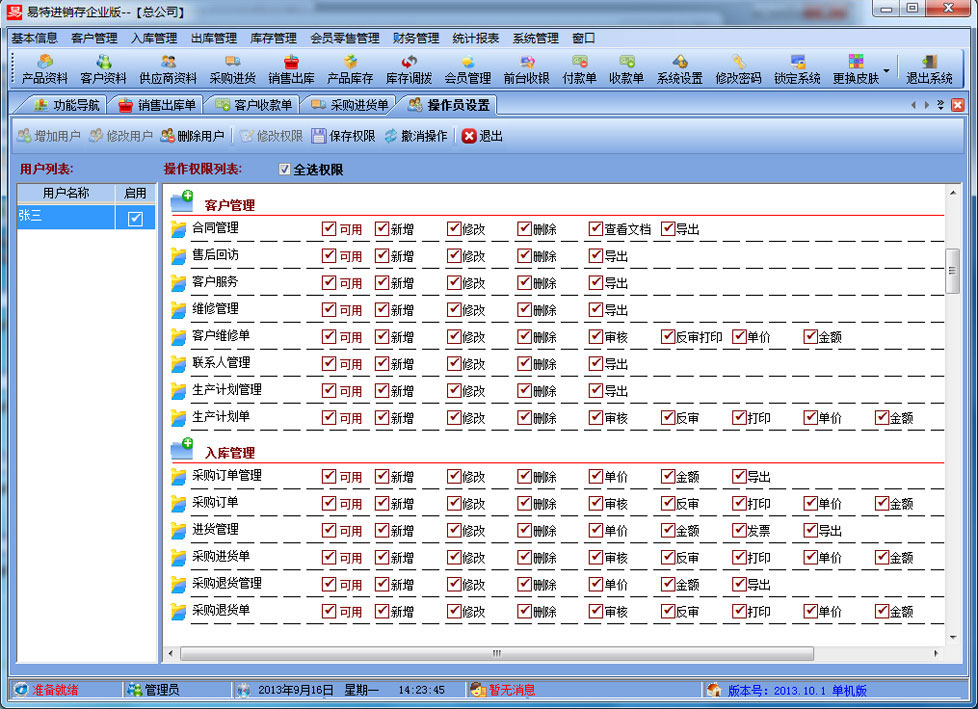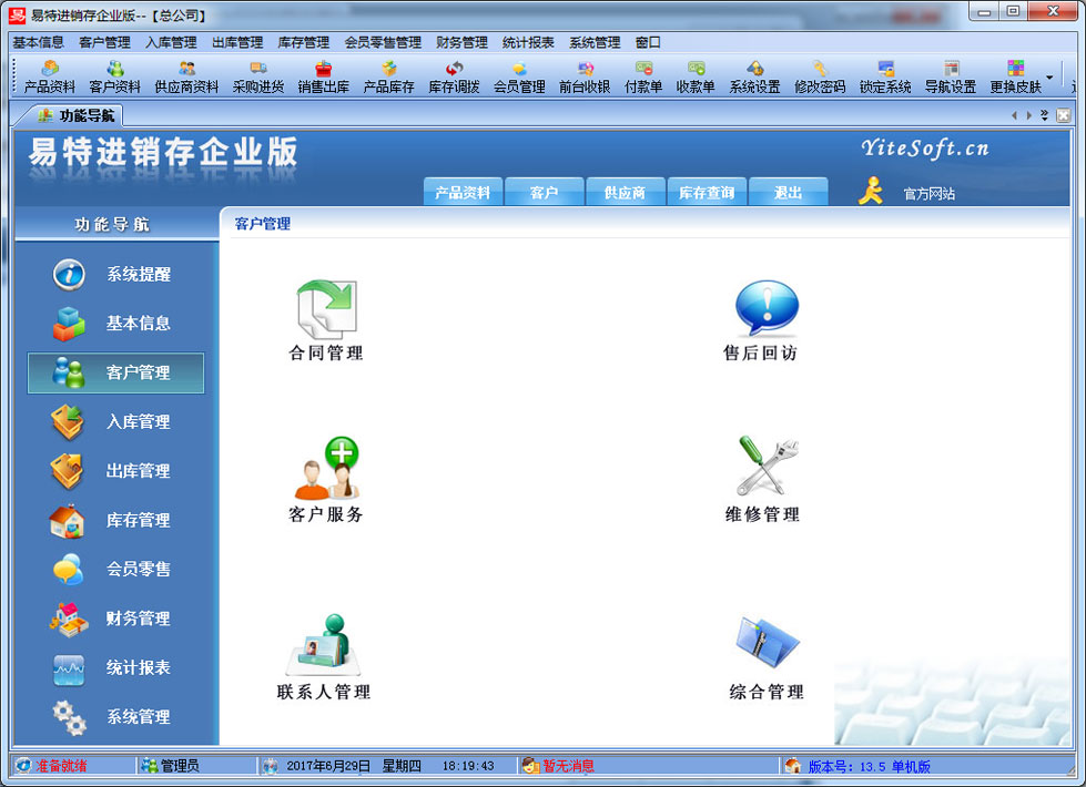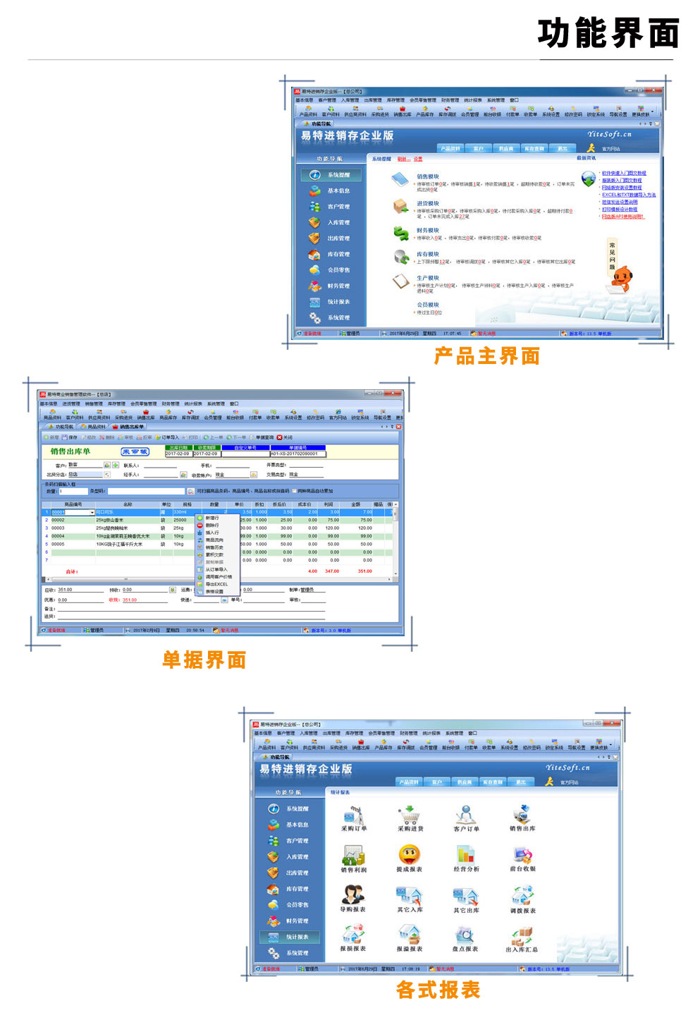易特進(jìn)銷(xiāo)存企業(yè)版是一款專(zhuān)業(yè)的進(jìn)銷(xiāo)存管理軟件,其中包含商品銷(xiāo)售管理系統(tǒng) ,庫(kù)存管理系統(tǒng)(倉(cāng)庫(kù)管理系統(tǒng)),財(cái)務(wù)和報(bào)表系統(tǒng)等子模塊。軟件界面設(shè)計(jì)簡(jiǎn)潔,美觀,其人性化的軟件流程,使普通用戶不需培訓(xùn)也能很快掌握軟件操作使用方法,上手極易。強(qiáng)大報(bào)表與集成查詢功能是本軟件的最大特色,所有功能在用戶需要的使用地方自然體現(xiàn),不用打開(kāi)多個(gè)窗口重復(fù)查詢。易特進(jìn)銷(xiāo)存軟件廣泛適用于企業(yè),商貿(mào)公司,個(gè)體門(mén)店等用于商業(yè)銷(xiāo)售管理, 庫(kù)存管理,財(cái)務(wù)管理等,客戶管理,員工管理等場(chǎng)合,是您企業(yè)進(jìn)行信息化管理的強(qiáng)大工具。 客戶管理:客戶合同、聯(lián)系人,售后服務(wù)及維修管理等。 入庫(kù)管理:進(jìn)行產(chǎn)品采購(gòu)入庫(kù),采購(gòu)?fù)素,進(jìn)貨單據(jù)和退貨單據(jù)查詢,供應(yīng)商往來(lái)帳務(wù),供應(yīng)商付款。 出庫(kù)管理:銷(xiāo)售出貨,客戶退貨,銷(xiāo)售單據(jù)和客戶退貨查詢,客戶往來(lái)帳務(wù),客戶付款。 來(lái)料加工:針對(duì)客戶提供材料加工產(chǎn)品方式,計(jì)算加工費(fèi)用。 庫(kù)存管理:包括庫(kù)存之間貨品調(diào)拔,庫(kù)存報(bào)損、報(bào)溢,庫(kù)存盤(pán)點(diǎn)功能。 拆分組裝:整進(jìn)散出,或是整出散進(jìn)等可以自由的拆分組合產(chǎn)品。 財(cái)務(wù)管理:預(yù)付款、預(yù)收款,應(yīng)收應(yīng)付款,收入支出,發(fā)票管理。 會(huì)員零售:可實(shí)現(xiàn)工廠加門(mén)店的方式,工廠走銷(xiāo)售流程,門(mén)店走會(huì)員零售流程。 統(tǒng)計(jì)報(bào)表:完整的統(tǒng)計(jì)查詢功能,每張單據(jù)每次業(yè)務(wù)金額都可以清楚的反映。 權(quán)限管理:可添加刪除系統(tǒng)操作員帳號(hào),強(qiáng)大的權(quán)限控制,可以設(shè)置某用戶對(duì)某窗口某個(gè)按鈕的權(quán)限。 打印設(shè)計(jì):可對(duì)系統(tǒng)內(nèi)每個(gè)單據(jù)進(jìn)行打印的格式設(shè)計(jì),可以導(dǎo)出,導(dǎo)入,每個(gè)操作員可設(shè)計(jì)自己的打印格式。 界面設(shè)計(jì):系統(tǒng)窗口界面名稱(chēng)可以自定義設(shè)計(jì),表格的顯示順序,寬度,是否顯示等,每個(gè)操作員可以設(shè)計(jì)自己的界面。 系統(tǒng)設(shè)置:可以靈活設(shè)置系統(tǒng)小數(shù)位數(shù),可選0-6位,讓帳務(wù)更精確,可對(duì)以往數(shù)據(jù)進(jìn)行選擇性的清除,以便系統(tǒng)初始化。 數(shù)據(jù)備份:可隨時(shí)對(duì)系統(tǒng)數(shù)據(jù)庫(kù)進(jìn)行安全備份,以防數(shù)據(jù)丟失。 |