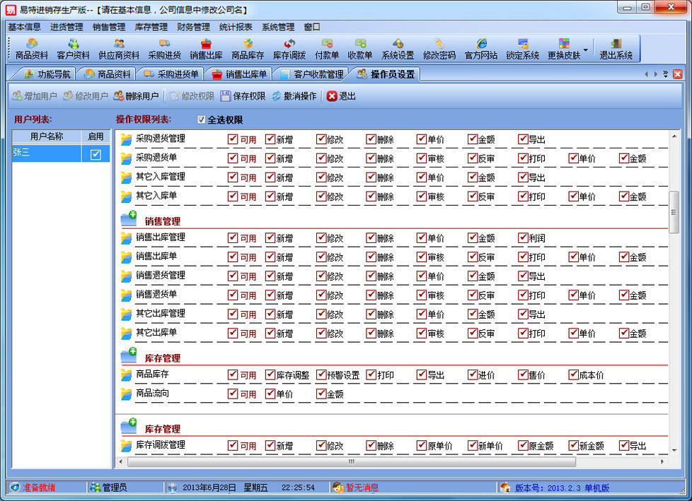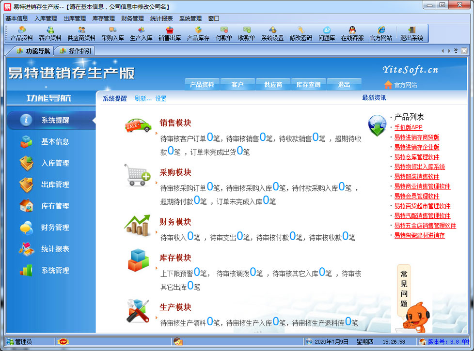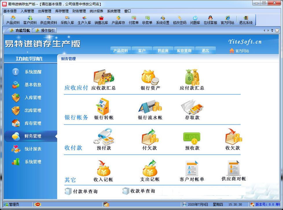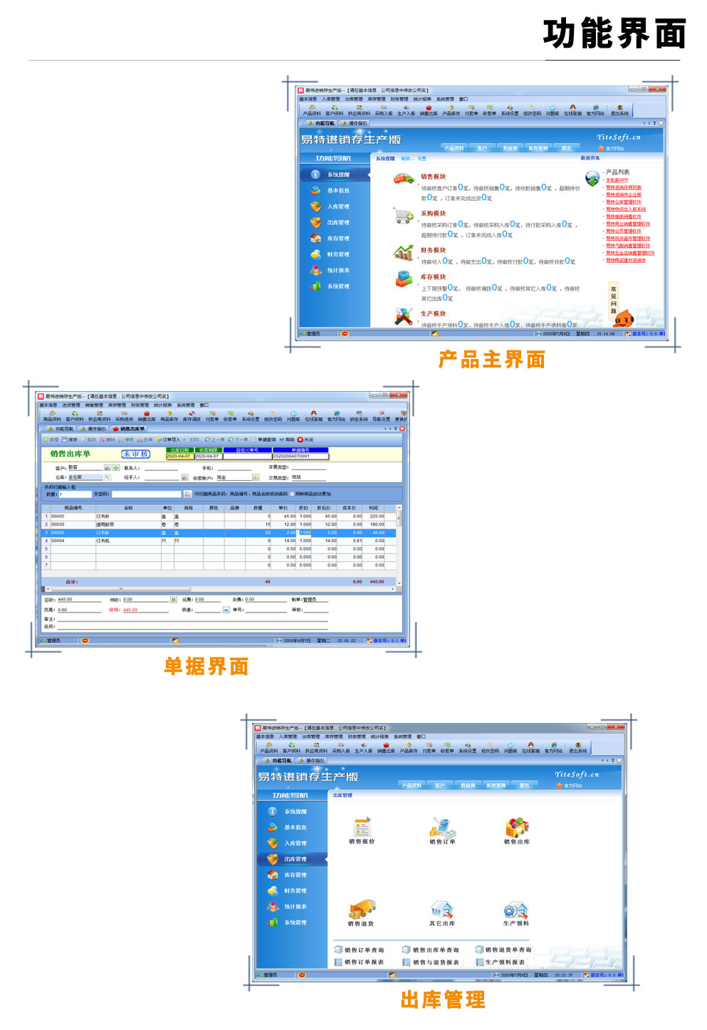 易特進(jìn)銷存生產(chǎn)版是一款專業(yè)的進(jìn)銷存管理軟件,其中包含產(chǎn)品銷售管理系統(tǒng) ,庫(kù)存管理系統(tǒng)(倉(cāng)庫(kù)管理系統(tǒng)),財(cái)務(wù)和報(bào)表系統(tǒng)等子模塊。軟件界面設(shè)計(jì)簡(jiǎn)潔,美觀,其人性化的軟件流程,使普通用戶不需培訓(xùn)也能很快掌握軟件操作使用方法,上手極易。強(qiáng)大報(bào)表與集成查詢功能是本軟件的最大特色,所有功能在用戶需要的使用地方自然體現(xiàn),不用打開多個(gè)窗口重復(fù)查詢。易特進(jìn)銷存軟件廣泛適用于企業(yè),商貿(mào)公司,個(gè)體門店等用于商業(yè)銷售管理, 庫(kù)存管理,財(cái)務(wù)管理等,客戶管理,員工管理等場(chǎng)合,是您企業(yè)進(jìn)行信息化管理的強(qiáng)大工具。 入庫(kù)管理:進(jìn)行產(chǎn)品采購(gòu)入庫(kù),采購(gòu)?fù)素,進(jìn)貨單據(jù)和退貨單據(jù)查詢 出庫(kù)管理:銷售出貨,客戶退貨,銷售單據(jù)和客戶退貨查詢。 庫(kù)存管理:包括庫(kù)存之間貨品調(diào)拔,庫(kù)存報(bào)損、報(bào)溢,庫(kù)存盤點(diǎn)功能。 財(cái)務(wù)管理:預(yù)付款、預(yù)收款,應(yīng)收應(yīng)付款,收入支出,,供應(yīng)商往來(lái)帳務(wù),供應(yīng)商付款,客戶往來(lái)帳務(wù),客戶付款 。 統(tǒng)計(jì)報(bào)表:完整的統(tǒng)計(jì)查詢功能,每張單據(jù)每次業(yè)務(wù)金額都可以清楚的反映。 權(quán)限管理:可添加刪除系統(tǒng)操作員帳號(hào),強(qiáng)大的權(quán)限控制,可以設(shè)置某用戶對(duì)某窗口某個(gè)按鈕的權(quán)限。 打印設(shè)計(jì):可對(duì)系統(tǒng)內(nèi)每個(gè)單據(jù)進(jìn)行打印的格式設(shè)計(jì),可以導(dǎo)出,導(dǎo)入,每個(gè)操作員可設(shè)計(jì)自己的打印格式。 界面設(shè)計(jì):系統(tǒng)窗口界面名稱可以自定義設(shè)計(jì),表格的顯示順序,寬度,是否顯示等,每個(gè)操作員可以設(shè)計(jì)自己的界面。 系統(tǒng)設(shè)置:可以靈活設(shè)置系統(tǒng)小數(shù)位數(shù),可選0-6位,讓帳務(wù)更精確,可對(duì)以往數(shù)據(jù)進(jìn)行選擇性的清除,以便系統(tǒng)初始化。 數(shù)據(jù)備份:可隨時(shí)對(duì)系統(tǒng)數(shù)據(jù)庫(kù)進(jìn)行安全備份,以防數(shù)據(jù)丟失。 |