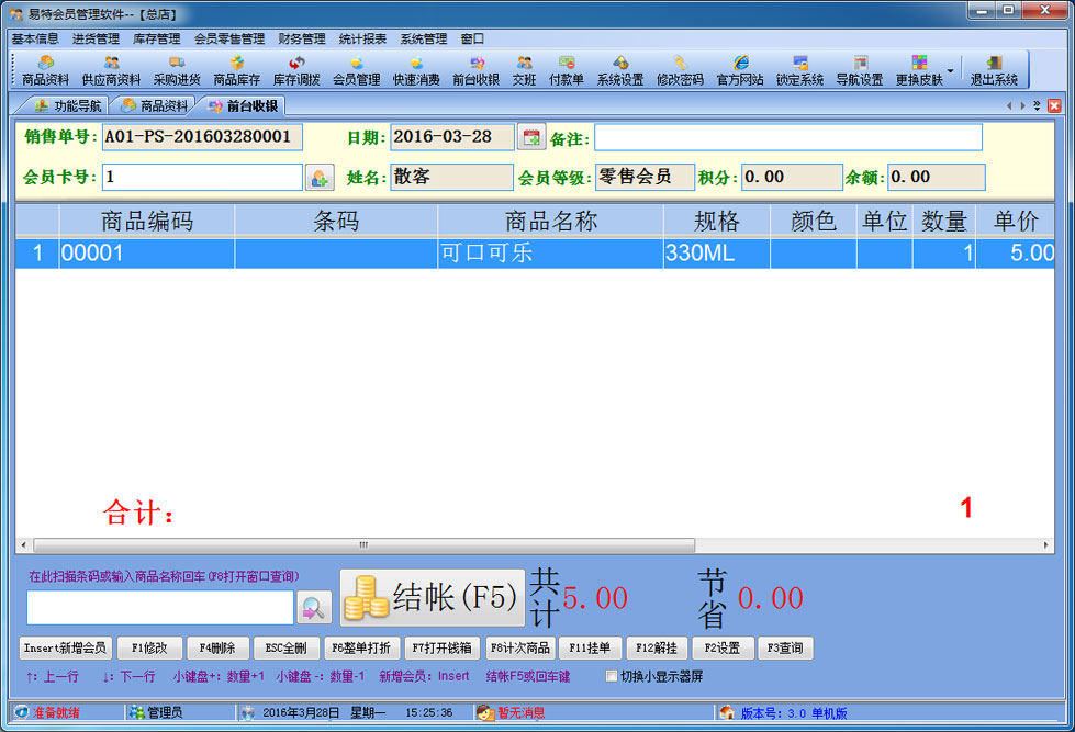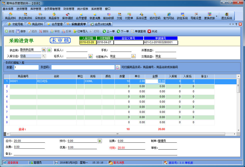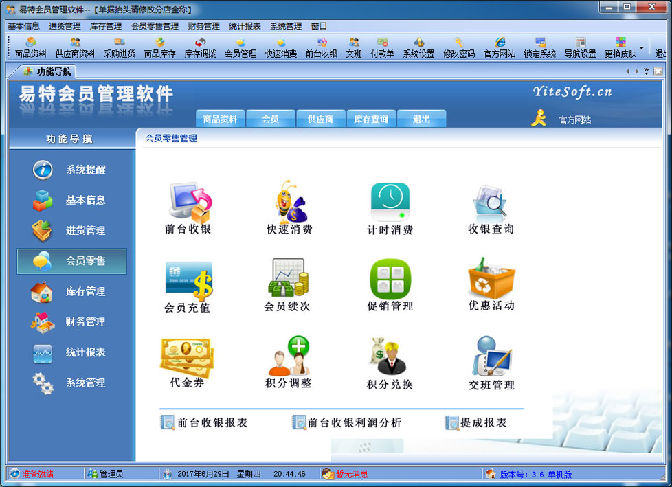 1、積分管理:可設(shè)置單品銷售積分,消費(fèi)多少元積1分,推薦一名會(huì)員積多少分或是下線會(huì)員積多少分上線自動(dòng)積分等 2、會(huì)員卡功能:支持儲(chǔ)值,計(jì)次,計(jì)時(shí)消費(fèi),會(huì)員提醒(包括生日提醒),會(huì)員來電提示,短信群發(fā)。 3、支持POS58,POS80小票打印,客戶顯示屏。 4、會(huì)員卡可以使用條碼卡、磁條卡、ID卡、IC卡。 5、支持多種結(jié)帳方式:現(xiàn)金、儲(chǔ)值卡、代金券、刷卡,支付寶,微信等。 6、支持連鎖分店管理,各店數(shù)據(jù)可共享或獨(dú)立 7、可以在各個(gè)分店內(nèi)統(tǒng)一刷卡消費(fèi)和積分,統(tǒng)一管理經(jīng)營。 8、支持POS銷售?梢愿鶕(jù)需要選配打印機(jī)、讀卡器、會(huì)員卡、條碼槍、錢箱、顧客顯示屏及小票打印機(jī);可以根據(jù)自已喜好設(shè)計(jì)各種有特性的打印格式。銷售時(shí)可以適時(shí)掌握每一個(gè)商品的當(dāng)前庫存數(shù),銷售成本、銷售毛利; 9、會(huì)員管理。可設(shè)置會(huì)員級別,不同級別可以適用不同的價(jià)格與折扣.可以自動(dòng)計(jì)算會(huì)員的累計(jì)消費(fèi)、累計(jì)積分、兌現(xiàn)積分及剩余積分情況。過生日的會(huì)員可自動(dòng)提醒; 10、在選擇商品時(shí)可以多選,即可以一次可以選擇多個(gè)商品; 11、可以設(shè)置單價(jià)、數(shù)量及銷售金額的核算精度即設(shè)置小數(shù)點(diǎn)位數(shù); 12、可以適時(shí)顯示往來單位(供貨商)的應(yīng)付帳款、預(yù)付帳款; 13、無處不在的顯示商品圖片的功能.支持圖片存放數(shù)據(jù)庫中,也可以存放軟件目錄文件夾中; 14、支持手工盤點(diǎn)(直接輸入需要盤點(diǎn)的商品)、自動(dòng)盤點(diǎn)(直接對整個(gè)分店進(jìn)行盤點(diǎn))及盤點(diǎn)機(jī)盤點(diǎn); 15、權(quán)限設(shè)置功能強(qiáng)大.可以設(shè)置每個(gè)員工的菜單操作權(quán)、單據(jù)操作權(quán)、操作權(quán)及其他操作權(quán)限{比如:查看成本權(quán)(即能不能看到進(jìn)價(jià)及毛利)、售價(jià)調(diào)整權(quán)(即能不能在銷售時(shí)修改售價(jià)及折扣)等}; 16、支持?jǐn)?shù)據(jù)導(dǎo)入導(dǎo)出(比如:從其它軟件中導(dǎo)入期初庫存,商品資料,客戶,供應(yīng)商,會(huì)員等...... 17、 單據(jù)支持自定義設(shè)計(jì)格式、打印前預(yù)覽,并且可以導(dǎo)出為Excel文件,然后根據(jù)您的實(shí)際需要進(jìn)行特別編排處理; 18、功能強(qiáng)大的各類統(tǒng)計(jì)報(bào)表,為您提供詳盡的營業(yè)報(bào)告,讓您對商品進(jìn)、銷、存及利潤等財(cái)務(wù)狀況了如指掌; 19、升級智能化。您只需輕點(diǎn)鼠標(biāo),便可通過互聯(lián)網(wǎng)實(shí)現(xiàn)軟件的升級,免除您升級之苦。 |