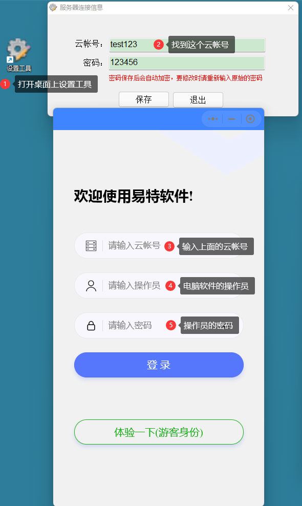 1.先安裝電腦版的軟件,桌面上有一個(gè)設(shè)置工具,打開后輸入云帳號(hào)和密碼。 2.打開微信小程序,在云帳號(hào)上輸入和設(shè)置工具一樣的帳號(hào)。 3.在操作員這里輸入電腦軟件的操作員,如果是第一次新裝軟件,輸入【管理員】,密碼默認(rèn)為123456,進(jìn)軟件后請修改密碼。 4.如果有多個(gè)操作員,進(jìn)軟件后,在軟件上【系統(tǒng)管理】--【操作員設(shè)置】,新增用戶,可以添加多個(gè)操作員帳號(hào),電腦和小程序都可以登陸這個(gè)帳號(hào) |