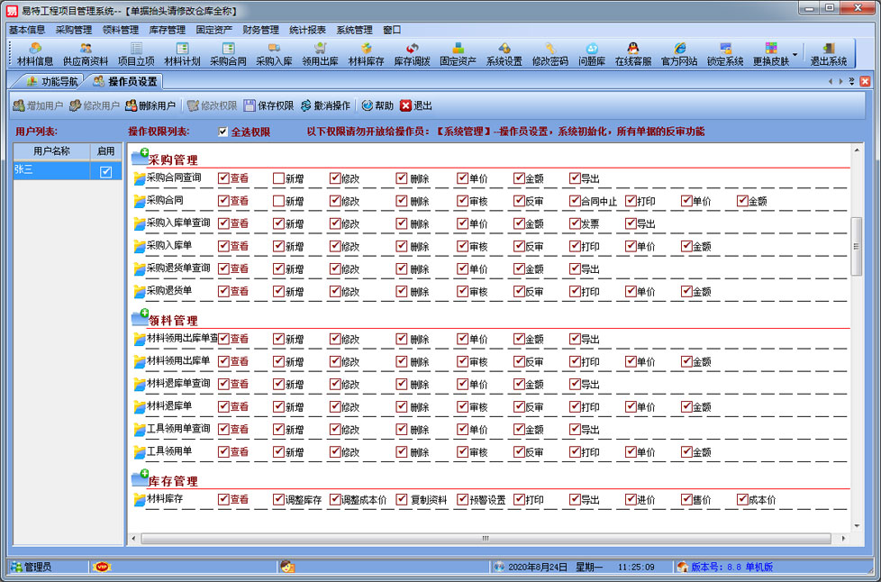 權(quán)限管理:可添加刪除系統(tǒng)操作員帳號(hào),強(qiáng)大的權(quán)限控制,可以設(shè)置某用戶對(duì)某窗口某個(gè)按鈕的權(quán)限。