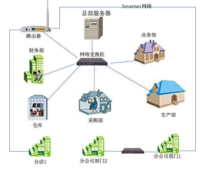 1、同在一個辦公室或一個庫房或一座大樓等多臺電腦同時辦公,又有門店,分公司等局域網(wǎng)+互聯(lián)網(wǎng)混合使用。