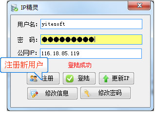 1、注冊IP精靈帳號,在服務(wù)器端上點擊“IP精靈”,打開如圖所示的窗口,點擊“注冊”按鈕后注冊一個帳號和密碼并登陸上