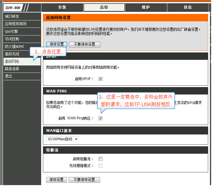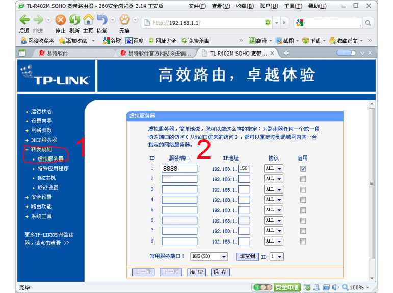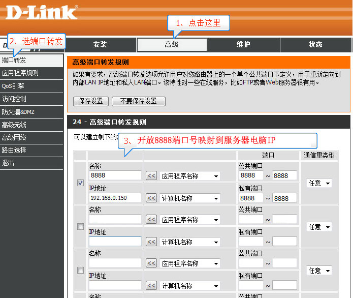 進去路由器后,點擊左側(cè)“轉(zhuǎn)發(fā)規(guī)則”---“虛擬服務(wù)器”,添加端口,如8888,IP地址為服務(wù)器端電腦的IP,如這里是192.168.1.150,協(xié)議TCP或是ALL,不能是UDP,后面要選用啟用,這樣當外部網(wǎng)絡(luò)請求該端口時自動將該請求轉(zhuǎn)到所設(shè)置IP的電腦上,需要注意的事項,安全設(shè)置里面有一個“高級安全設(shè)置”中的“忽略來自WAN口的Ping”一定不要選中,否則外部不能連接,該功能的意思是當外部請求時自動放棄。