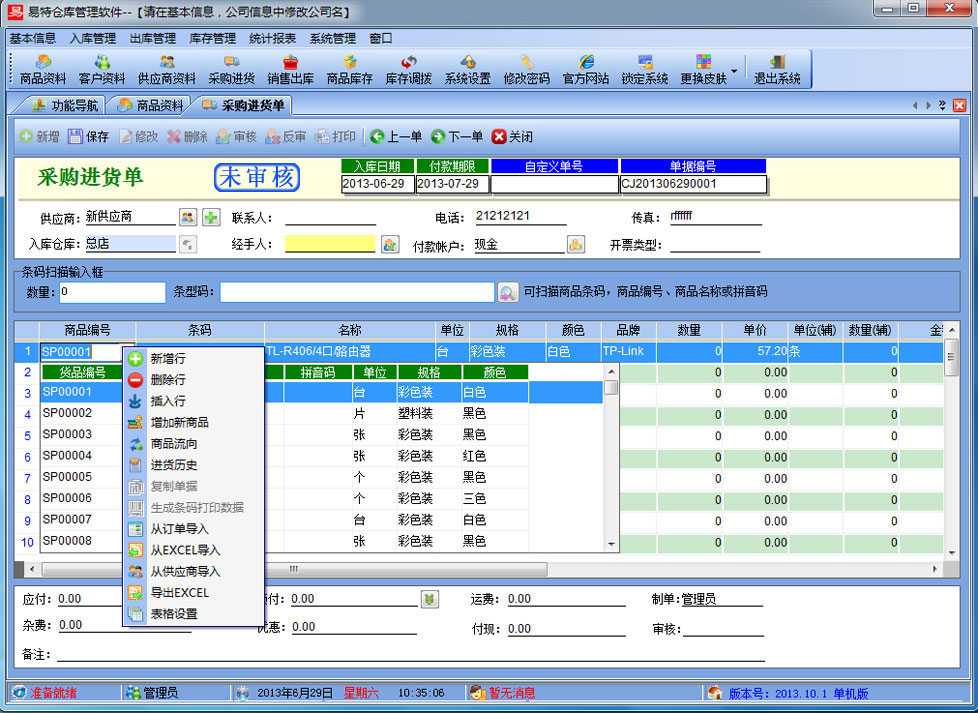 | 易特倉(cāng)庫(kù)管理軟件是一款專業(yè)的倉(cāng)庫(kù)管理軟件,其中包含商品銷售管理系統(tǒng) ,庫(kù)存管理系統(tǒng)(倉(cāng)庫(kù)管理系統(tǒng)),報(bào)表系統(tǒng)等子模塊。軟件界面設(shè)計(jì)簡(jiǎn)潔,美觀,其人性化的軟件流程,使普通用戶不需培訓(xùn)也能很快掌握軟件操作使用方法,上手極易。強(qiáng)大報(bào)表與集成查詢功能是本軟件的最大特色,所有功能在用戶需要的使用地方自然體現(xiàn),不用打開(kāi)多個(gè)窗口重復(fù)查詢。易特倉(cāng)庫(kù)管理軟件廣泛適用于企業(yè),商貿(mào)公司,個(gè)體門(mén)店等用于商業(yè)銷售管理, 庫(kù)存管理等,客戶管理,員工管理等場(chǎng)合,是您企業(yè)進(jìn)行信息化管理的強(qiáng)大工具。 功能簡(jiǎn)介 基礎(chǔ)數(shù)據(jù):商品信息,供應(yīng)商,客戶,商品分類,倉(cāng)庫(kù),銀行等基本信息的設(shè)置。 入庫(kù)管理:進(jìn)行貨品采購(gòu)入庫(kù),采購(gòu)?fù)素,生產(chǎn)入庫(kù),生產(chǎn)退料,進(jìn)貨單據(jù)和退貨單據(jù)查詢。 出庫(kù)管理:銷售出貨,客戶退貨,生產(chǎn)領(lǐng)料,銷售單據(jù)和客戶退貨查詢。 庫(kù)存管理:包括庫(kù)存之間貨品調(diào)拔,庫(kù)存報(bào)損、報(bào)溢,庫(kù)存盤(pán)點(diǎn)功能。 拆分組裝:整進(jìn)散出,或是整出散進(jìn)等可以自由的拆分組合產(chǎn)品。 統(tǒng)計(jì)報(bào)表:完整的統(tǒng)計(jì)查詢功能,每張單據(jù)每次業(yè)務(wù)金額都可以清楚的反映。 權(quán)限管理:可添加刪除系統(tǒng)操作員帳號(hào),強(qiáng)大的權(quán)限控制,可以設(shè)置某用戶對(duì)某窗口某個(gè)按鈕的權(quán)限。 打印設(shè)計(jì):可對(duì)系統(tǒng)內(nèi)每個(gè)單據(jù)進(jìn)行打印的格式設(shè)計(jì),可以導(dǎo)出,導(dǎo)入,每個(gè)操作員可設(shè)計(jì)自己的打印格式。 界面設(shè)計(jì):系統(tǒng)窗口界面名稱可以自定義設(shè)計(jì),表格的顯示順序,寬度,是否顯示等,每個(gè)操作員可以設(shè)計(jì)自己的界面。 系統(tǒng)設(shè)置:可以靈活設(shè)置系統(tǒng)小數(shù)位數(shù),可選0-6位,讓帳務(wù)更精確,可對(duì)以往數(shù)據(jù)進(jìn)行選擇性的清除,以便系統(tǒng)初始化。 數(shù)據(jù)備份:可隨時(shí)對(duì)系統(tǒng)數(shù)據(jù)庫(kù)進(jìn)行安全備份,以防數(shù)據(jù)丟失。