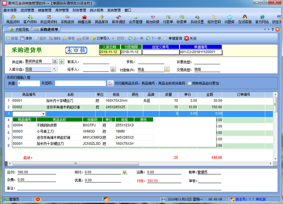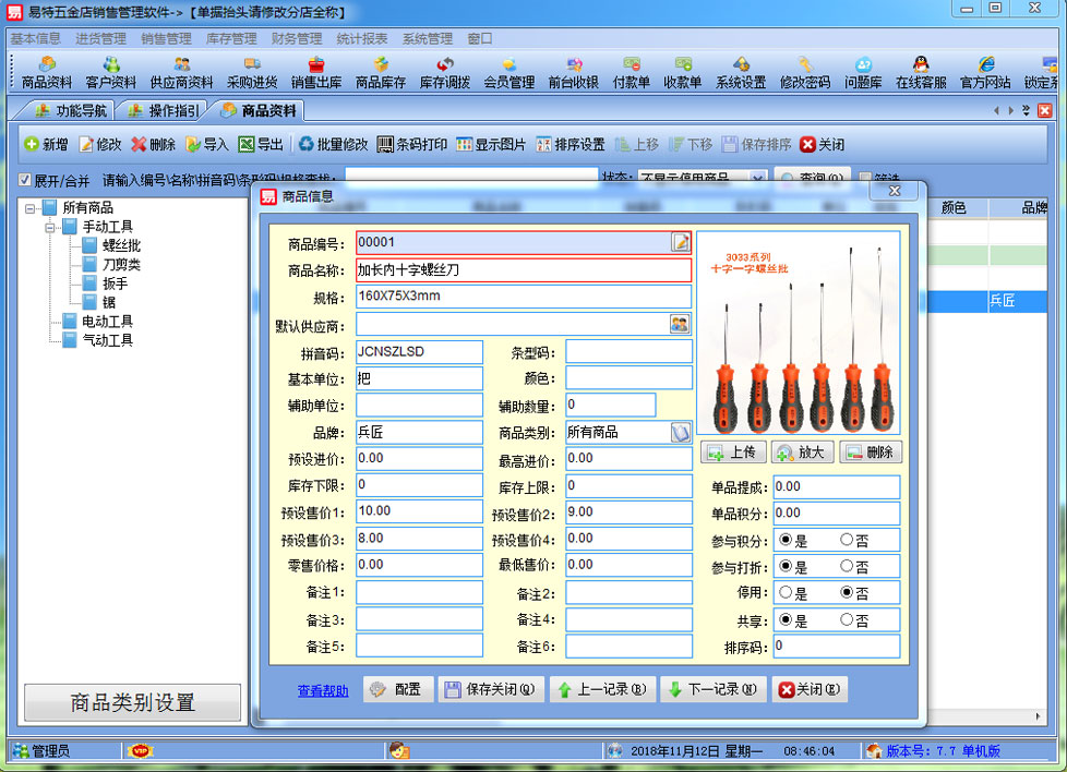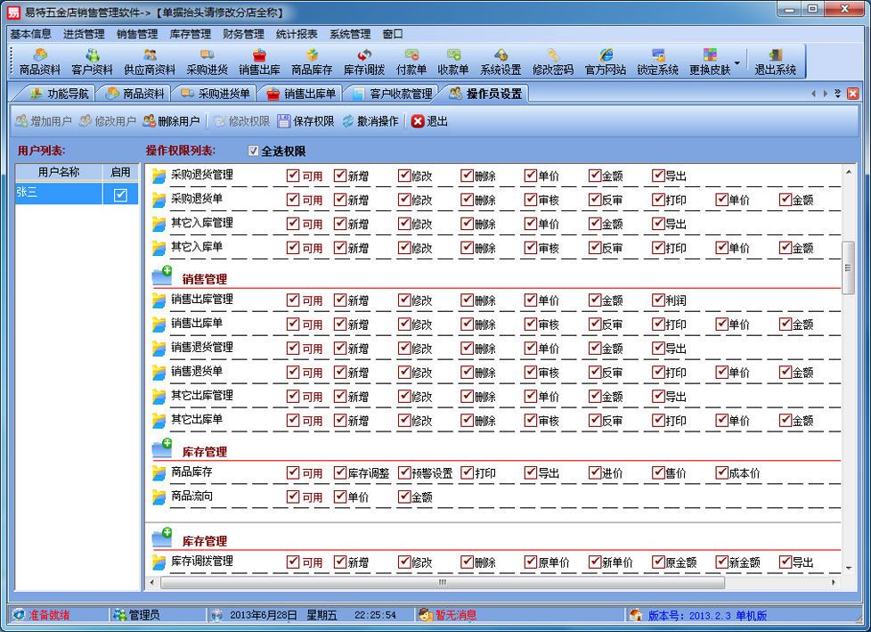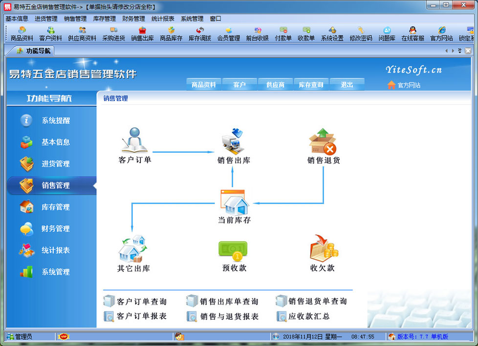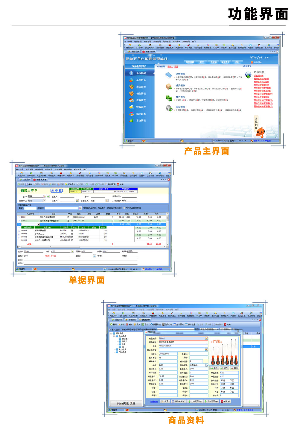 | 易特五金店銷售管理軟件是一款專業(yè)的針對(duì)五金店而設(shè)計(jì)的銷售管理軟件,其中包含商品銷售管理系統(tǒng) ,庫(kù)存管理系統(tǒng)(倉(cāng)庫(kù)管理系統(tǒng)),財(cái)務(wù)和報(bào)表系統(tǒng)等子模塊。軟件界面設(shè)計(jì)簡(jiǎn)潔,美觀,其人性化的軟件流程,使普通用戶不需培訓(xùn)也能很快掌握軟件操作使用方法,上手極易。強(qiáng)大報(bào)表與集成查詢功能是本軟件的最大特色,所有功能在用戶需要的使用地方自然體現(xiàn),不用打開多個(gè)窗口重復(fù)查詢。易特進(jìn)銷存軟件廣泛適用于企業(yè),商貿(mào)公司,個(gè)體門店等用于商業(yè)銷售管理, 庫(kù)存管理,財(cái)務(wù)管理等,客戶管理,員工管理等場(chǎng)合,是您企業(yè)進(jìn)行信息化管理的強(qiáng)大工具。 基礎(chǔ)數(shù)據(jù):商品信息,供應(yīng)商,客戶,商品分類,倉(cāng)庫(kù),銀行等基本信息的設(shè)置。 入庫(kù)管理:進(jìn)行貨品采購(gòu)入庫(kù),采購(gòu)?fù)素,進(jìn)貨單據(jù)和退貨單據(jù)查詢,供應(yīng)商往來(lái)帳務(wù),供應(yīng)商付款。 出庫(kù)管理:銷售出貨,客戶退貨,銷售單據(jù)和客戶退貨查詢,客戶往來(lái)帳務(wù),客戶付款。 庫(kù)存管理:包括庫(kù)存之間貨品調(diào)拔,庫(kù)存報(bào)損、報(bào)溢,庫(kù)存盤點(diǎn)功能。 拆分組裝:整進(jìn)散出,或是整出散進(jìn)等可以自由的拆分組合產(chǎn)品。 統(tǒng)計(jì)報(bào)表:完整的統(tǒng)計(jì)查詢功能,每張單據(jù)每次業(yè)務(wù)金額都可以清楚的反映。 權(quán)限管理:可添加刪除系統(tǒng)操作員帳號(hào),強(qiáng)大的權(quán)限控制,可以設(shè)置某用戶對(duì)某窗口某個(gè)按鈕的權(quán)限。 打印設(shè)計(jì):可對(duì)系統(tǒng)內(nèi)每個(gè)單據(jù)進(jìn)行打印的格式設(shè)計(jì),可以導(dǎo)出,導(dǎo)入,每個(gè)操作員可設(shè)計(jì)自己的打印格式。 界面設(shè)計(jì):系統(tǒng)窗口界面名稱可以自定義設(shè)計(jì),表格的顯示順序,寬度,是否顯示等,每個(gè)操作員可以設(shè)計(jì)自己的界面。 系統(tǒng)設(shè)置:可以靈活設(shè)置系統(tǒng)小數(shù)位數(shù),可選0-6位,讓帳務(wù)更精確,可對(duì)以往數(shù)據(jù)進(jìn)行選擇性的清除,以便系統(tǒng)初始化。 數(shù)據(jù)備份:可隨時(shí)對(duì)系統(tǒng)數(shù)據(jù)庫(kù)進(jìn)行安全備份,以防數(shù)據(jù)丟失。 |